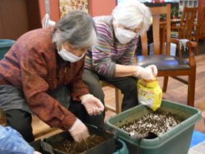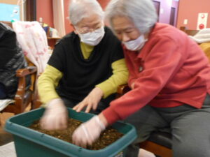 まずはぷプランターに肥料と虫よけ薬を混ぜるところからスタートです (^^)/